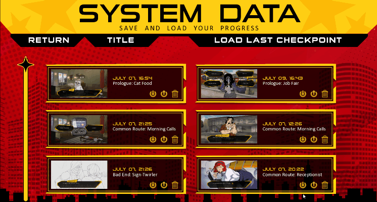 Next up is the save screen. I didn't have a specific concept in mind for this one (hence the default renpy format), but I do have strong preferences in save/load formatting from playing other games.